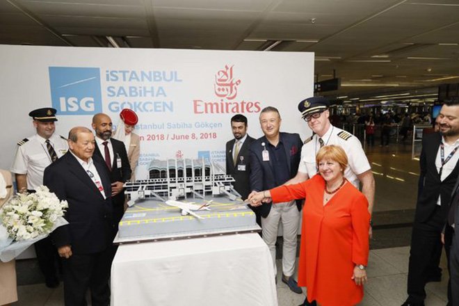 Dünyanın önde gelen havayolu şirketlerinden Emirates, bugün itibari ile İstanbul Sabiha Gökçen Uluslararası Havalimanı’ndan uçuşlara başladı. Dubai’den Sabiha Gökçen Havalimanı’na gelen ilk uçak su takıyla karşılandı. İlk uçuş için düzenlenen törene İSG CEO’su Ersel Göral, İSG Yönetim Kurulu Üyesi Dato Che Azmi Bin Murad, Emirates Havayolları Türkiye Müdürü Bahar Ahmet Birinci ve çok sayıda yönetici katıldı. Tören sonunda pasta kesildi. İSG CEO’su Ersel Göral ve İSG Yönetim Kurulu Üyesi Dato Che Azmi Bin Murad ilk seferle gelen yolculara lokum dağıttı.