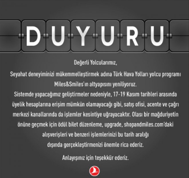 Aynı zamanda satış ofisi, acente ve çağrı merkezi kanallarında da işlemler kesintiye uğrayacak. Olası bir mağduriyetin yaşanmaması için ödül bilet düzenleme, upgrade, shopandmiles.com’daki alışverişleri bu tarih aralığı dışında gerçekleştiriniz denildi.