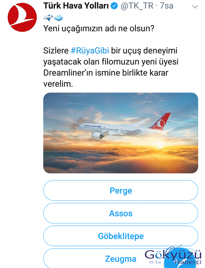 Dreamliner’ın ismi için ankette, “Yeni uçağımızın adı ne olsun? Sizlere #RüyaGibi bir uçuş deneyimi yaşatacak olan filomuzun yeni üyesi Dreamliner’ın ismine birlikte karar verelim.” ifadelerine yer verildi.