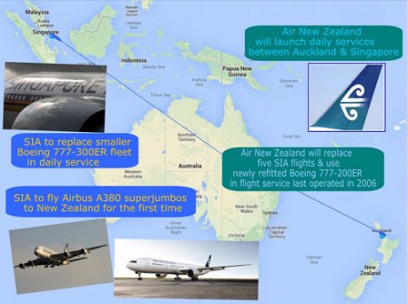 Singapur Havayolları, A380 ile her gün Singapur ile Auckland arasında uçuslar gerçeklestirecektir. Bu uçaklar, mevcut olan günlük uçuslarda kademeli olarak, daha küçük olan Boeing 777-300ER1’nin yerini alacaktır. Air New Zealand, Boeing 777-200ER model uçaklarla Auckland – Singapur arasında günlük uçuslara baslayacak, Singapur Havayolları tarafından her hafta yapılan bes uçusu devralacak ve bunlara iki yeni uçus daha ekleyerek uçus frekansını her güne çıkartacak.