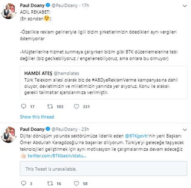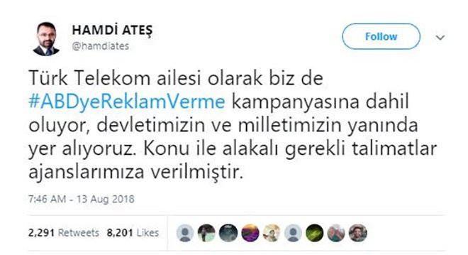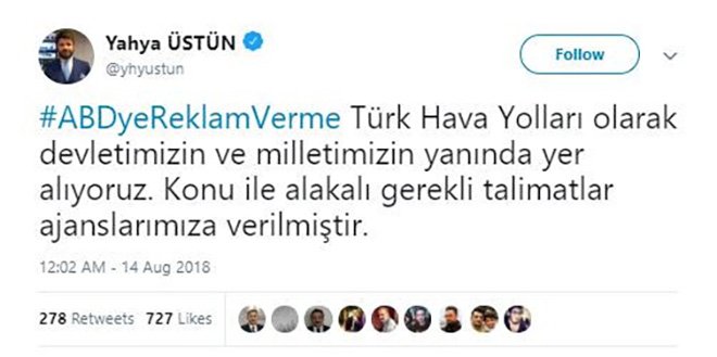 Türk Hava Yolları Basın Müşaviri Yahya Üstün, ABD’ye reklam verme haghtagi ile ‘Türk Hava Yolları olarak devletimizin ve milletimizin yanında yer alıyoruz. Konu ile alakalı gerekli talimatlar ajansımıza verilmiştir Twettiyle Amerikan şirketlerine reklamlarının verilmeyeceğini açıkladı.