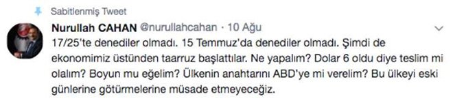 Hazine ve Maliye Bakanı Berat Albayrak ise, Tüm özel sektör paydaşlarımız çok sağlam ve kararlı bir duruş ortaya koydular. Buradan çok net söylemek istiyorum ki serbest piyasa kuralları içinde kalarak adımlarımızı atmaya devam edeceğiz. Türk liramızı koruyacağız. TL ile yürüyeceğiz. Önümüzdeki dönemde Türk Liramızın daha da güçleneceğini göreceğiz. Küresel finans piyasalarında bu şekilde saldırılara girişmek tüm ülkelerin piyasaları için risktir. Herkes net bir şekilde görmektedir ki artık dolar güvenilirliğini yitirmiştir’ dedi.