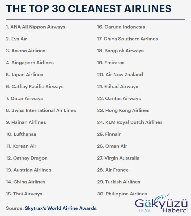 Her yıl milyonlarca yolcunun katıldığı anketler düzenleyen Skytrax, ‘en temiz havayolu şirketleri’ adlı araştırmanın sonuçlarını açıkladı. Yolcular bu kez de, dijital mecralar ve sosyal medya üzerinden yapılan anketin sonrasında en temiz 30 havayolu şirketini kullandıkları oylarla belirledi.