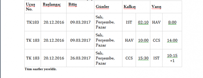 Havana ve Karakas’a Ait Tarifeli Uçuş Saatleri;