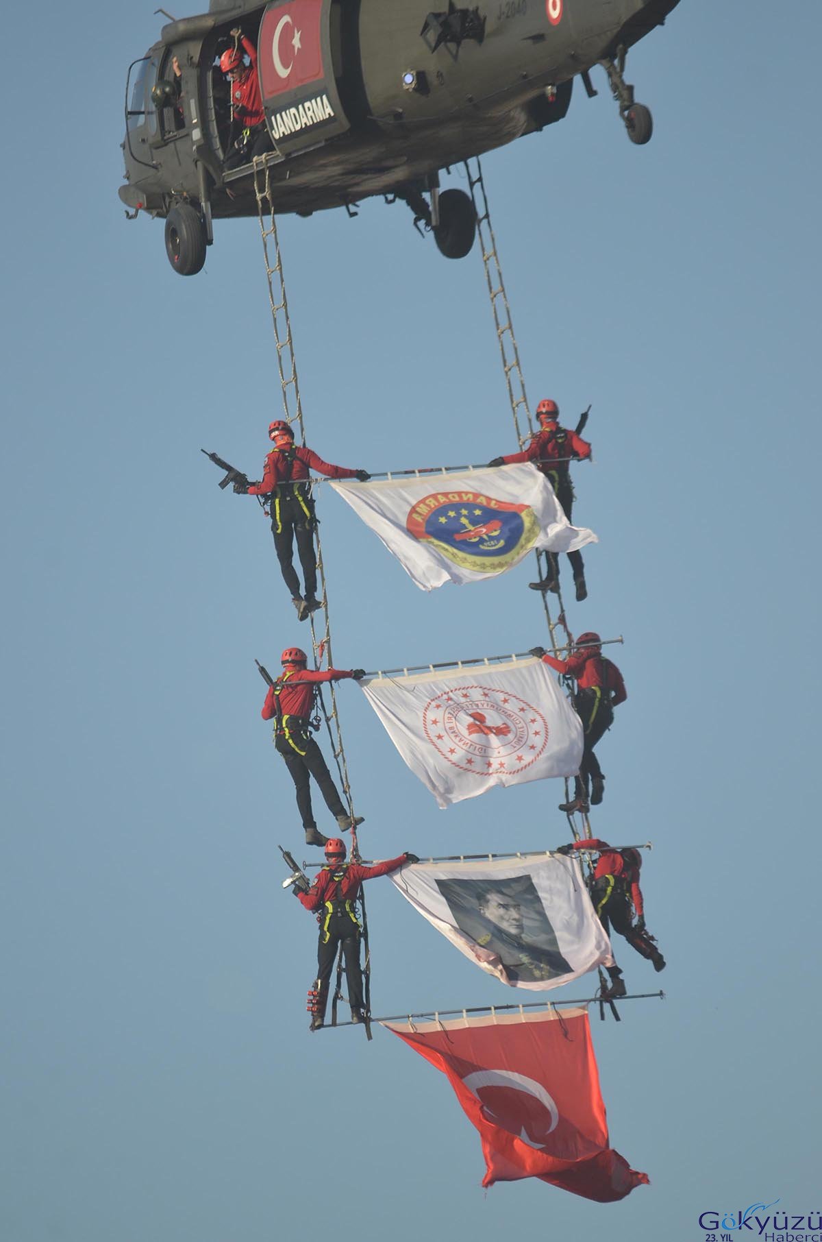 Jandarma Genel Komutanlığı ve Özel Asayiş Komutanlığı ekipleri ise ‘üzüm salkımı’ gösterisi ile büyük ilgi topladı. Yerden yüksek bir noktadan sergilenen bu özel gösteri, izleyenleri büyüledi. Eşsiz koordinasyonları ve cesur hareketleriyle Jandarma ekipleri, izleyicilere unutulmaz bir deneyim yaşattı.
