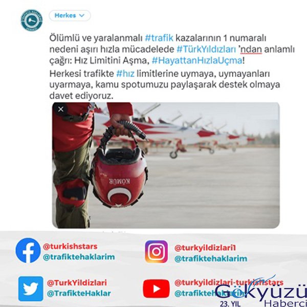 Trafik kazalarında başlıca ölüm nedeninin aşırı hız olduğu bilinirken, Emniyet Genel Müdürlüğü verileri 2015-2021 yılları arasında trafik kazaları sonucunda 44 bin 633 kişinin yaşamını yitirdiğini, yaklaşık 2 milyon kişinin yaralandığını gösterdi. Aşırı hızla mücadele kapsamında karayolu güvenliğine dikkat çekmek isteyen Trafikte Haklarım Derneği, Türkiye’nin 30 yılı aşkın süre ile gökyüzündeki milli takımı olan Türk Hava Kuvvetleri’nin Akrobasi Timi ‘Türk Yıldızları’ ekibinin katılımıyla anlamlı bir farkındalık kampanyasına ve kamu spotuna imza attı. Kampanyaya İçişleri Bakanlığı ve Milli Savunma Bakanlığı da destek verdi.