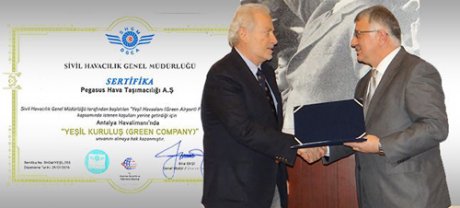 Havaalanlarında faaliyet gösteren kuruluşların, çevreye ve insan sağlığına verdikleri önem doğrultusundaki çalışmalarının artırılması amacıyla başlatılan ‘Yeşil Havaalanı’ projesine bağlı olarak bir kez daha ‘Yeşil Kuruluş’ seçilen Pegasus Hava Yolları, SHGM tarafından düzenlenen tören ile belgelerini aldı. Törene katılan Pegasus Hava Yolları Genel Müdürü Sertaç Haybat’a belgeleri Sivil Havacılık Genel Müdürü Bilal Ekşi teslim etti.